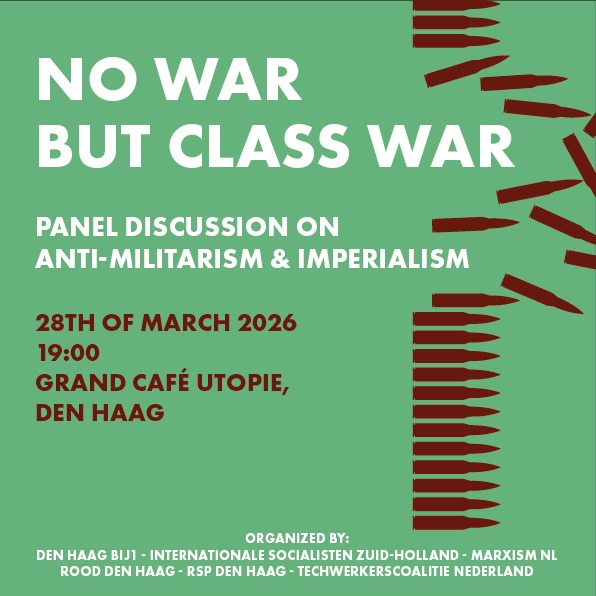A panel organized by left-wing political organizations (BIJ1 DenHaag, Internationale Socialisten Zuid-Holland, RSP Den Haag, ROOD Den Haag, Marxism-NL and Techwerkerscoalitie Nederland) to explore the links between imperialism and militarism and to revisit anti-militarism as an anti-imperialist strategy.